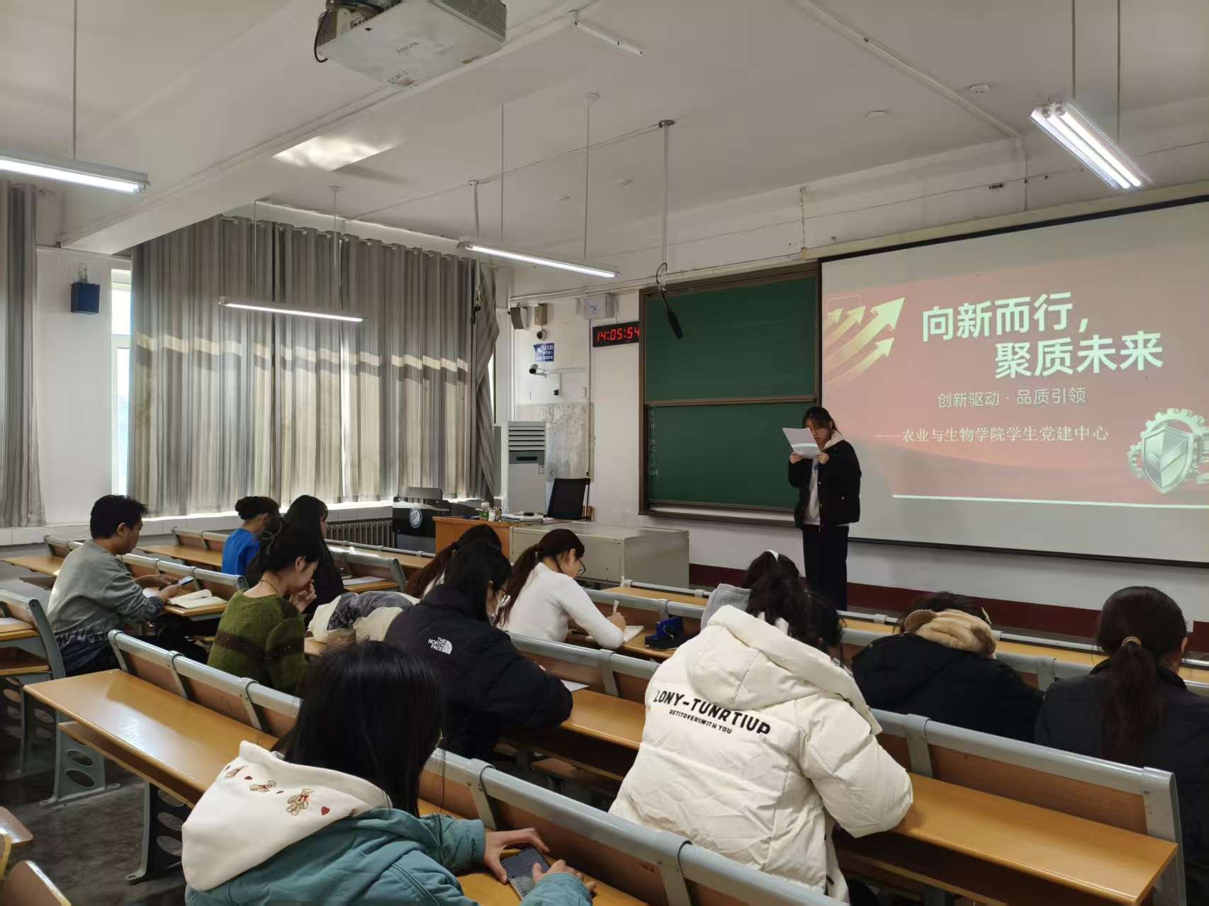 活动伊始,主持人带领全体学生深入研读《求是》发表的习近平总书记的重要文章《因地制宜发展新质生产力》,深入学习了新质生产力的核心理念、实践路径和战略部署等。随后,全体成员观看政策解读专题视频,视频通过宏观政策与产业案例相结合,生动呈现了科技创新驱动产业升级的实践场景,进一步强化了同学们对新质生产力的直观认识与时代使命感。 在专题研讨中,同学们围绕理解“向新而行”的核心内涵、结合案例谈谈品质引领对未来发展的意义、作为学生能为“聚质未来”做哪些行动展开深入交流,结合智慧农业、生物育种等前沿领域,探讨以技术创新回应时代需求的路径。大家据此撰写个人行动方案或感受,将专业思考转化为服务国家的实践规划,展现农生学院学子的使命担当。