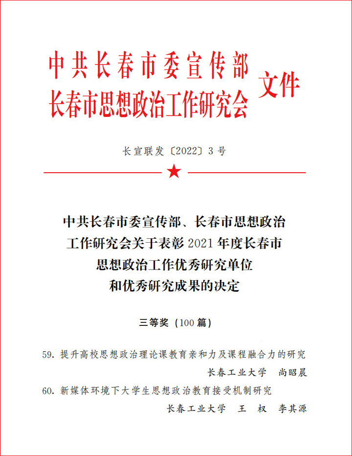 本网讯(通讯员 李其源)近日,中共长春市委宣传部、长春市思想政治工作研究会联合下发《关于表彰2021年度长春市思想政治工作优秀研究单位和优秀研究成果的决定》(长宣联发〔2022〕3号),澳门网投唯一官网尚昭晨撰写的《提升高校思想政治理论课教育亲和力及课程融合力的研究》、王权主持撰写的《新媒体环境下大学生思想政治教育接受机制研究》荣获三等奖。