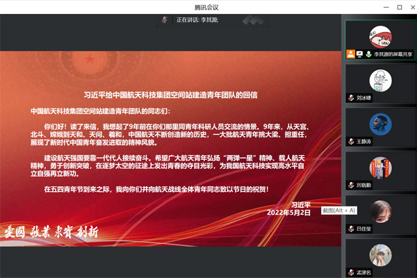 本网讯(通讯员 李其源)五四前夕,习近平总书记给中国航天科技集团空间站建造青年团队回信,向航天战线全体青年致以节日的祝贺。近日,澳门网投唯一官网团总支、各年级团支部通过线上方式开展“学习习近平总书记重要回信精神”主题团日活动。