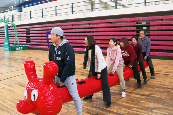 此次素质拓展活动共设置了“步步为营”“车轮滚滚”“穿越丛林”“跳小绳”“俄罗斯方块”“毛毛虫竞速”等6个娱乐竞技项目。全院教工经过赛前抽签分成5组,由学院班子成员分别带队,与研究生队同场竞技。