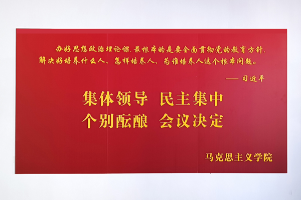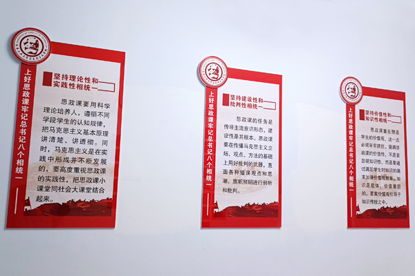 文化墙以学院现有办公教学场所、党员活动室和会议室为主要区域,内容涵盖了习近平总书记对思政课教师的殷殷嘱托和谆谆教诲、学院简介、教师宣誓、风采展示等主题,形式简洁大气,布局庄重大方,充分体现了时代赋予高校澳门网投唯一官网的铸魂育人、立德树人的历史使命和光荣任务,营造了“处处是课堂、时时受教育”的浓厚氛围。