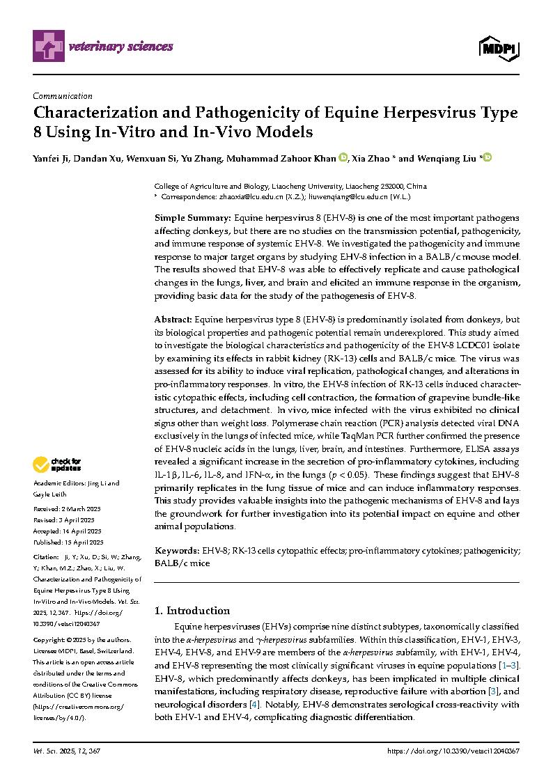 bat365官网2022级动物学专业研究生纪言霏在《Veternary Science》杂志上发表了题为“Characterization and Pathogenicity of Equine Herpesvirus Type 8 Using In-Vitro and In-Vivo Models”的研究论文,指导教师为刘文强教授、赵霞博士。