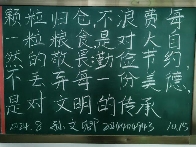 民以食为天,食以粮为先。粮食是生命的基础,节约是对未来的承诺。活动现场,同学们热情高涨,积极参与,他们纷纷拿起粉笔,在黑板上用心书写着有关节约粮食的佳句。一行行整齐划一的字迹,如同跳动的音符,奏响了节约粮食的乐章;一句句富含哲理的话语,如同晨钟暮鼓,唤醒了每个人心中对粮食的尊重与珍惜。