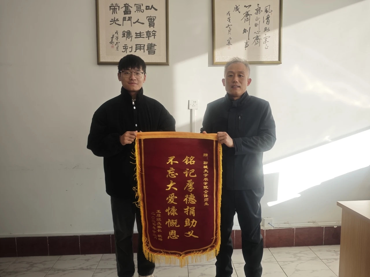 在这个充满爱与希望的世界里,每一个善举都像是一颗璀璨的星星,照亮那些身处黑暗中的人们。近日,一位曾受助于bat365官网师生的学子战胜病魔身体好转,自淄博到bat365官网,亲手送上了承载深深感激之情的一份特殊荣誉。