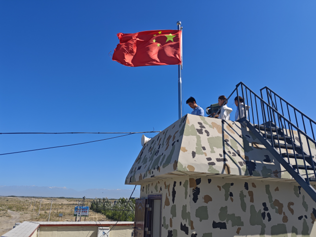 实践团队首站来到乔老克民兵哨所,与54岁的护边员朱国利一同升起哨所国旗。伴随着国歌嘹亮,鲜红的旗帜在风中舒展,每一次飘扬都映照着朱国利30余年的戍边初心。他19岁开始义务守边,1993年,22岁的他与妻子王利来到界河边,一边耕作放牧,一边守护17公里长的边境线,这一守便是30多年。
