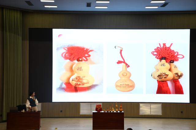 为增强学生的直观体验,赵燕还展示了葫芦雕刻技艺与工艺品制作流程,鼓励学生动手实践,在体验中领悟文化精髓。互动环节中,她围绕“葫芦如何演变为吉祥符号”“雕刻图案的象征体系”等问题与在场同学深入交流,现场气氛热烈,进一步激发了学生对传统文化的探索兴趣。