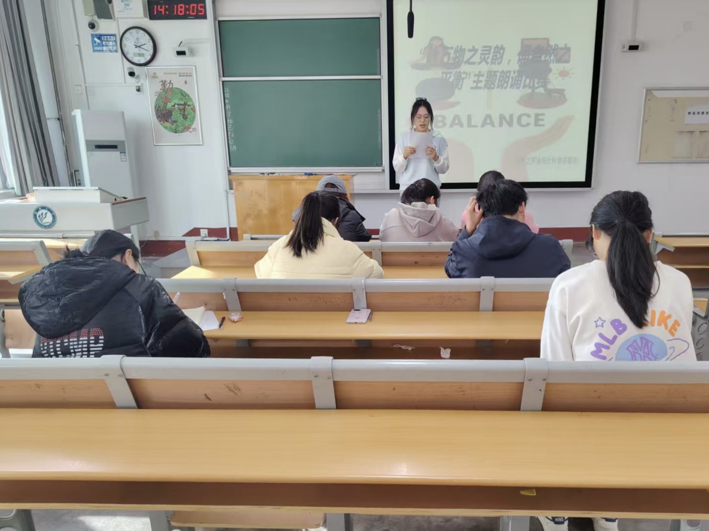 比赛过程中,同学们以青春视角解读主题:“当我们在实验室记录植物生长,在校园垃圾分类,都是在守护平衡的微光”“自然的灵韵,藏在图书馆前的银杏叶里,也在我们节约的每一滴水、每一度电中”,真挚的表达、饱满的情感赢得现场阵阵掌声。评委团从主题契合、语言表达、创意呈现等维度打分,最终评选出宋涵涵同学荣获一等奖,陈婧琦、王雨萌、徐智贤同学获得二等奖,于昊言、杨静怡同学获得三等奖。