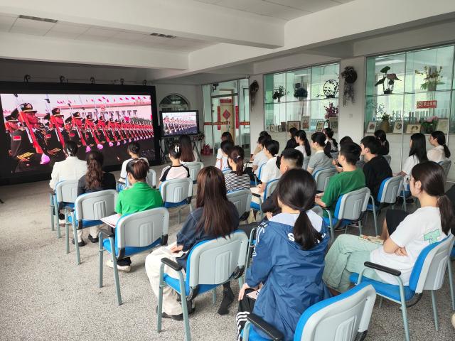 阅兵仪式开始,同学们全体肃立,神情庄重。习近平总书记发表重要讲话时,全场鸦雀无声,同学们认真聆听,深刻领会讲话中的历史意义与时代精神。随后,阅兵式和分列式依次进行,受阅部队以威武雄壮的阵容、昂扬奋进的风貌通过天安门广场。空中护旗梯队由多型直升机组成多个编队,通过护卫旗帜、编成字符、悬挂标语等方式,展现了在党的领导下国家和军队的发展壮大。徒步方队步伐整齐、口号响亮,装备方队铁甲生辉、气势磅礴,空中梯队战鹰列阵、翱翔长空,充分展示了我国国防和军队建设的巨大成就。
