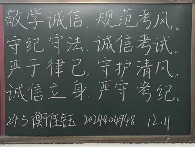 为加强学风建设,严肃考风考纪,引导学生树立正确的价值观和考试观,提升学生的诚信意识和自律能力,为即将到来的各类考试营造一个公平、公正、诚信的良好氛围。bat365中文官方网站于12月11日举办“明考纪,肃考风”黑板字书写活动活动。