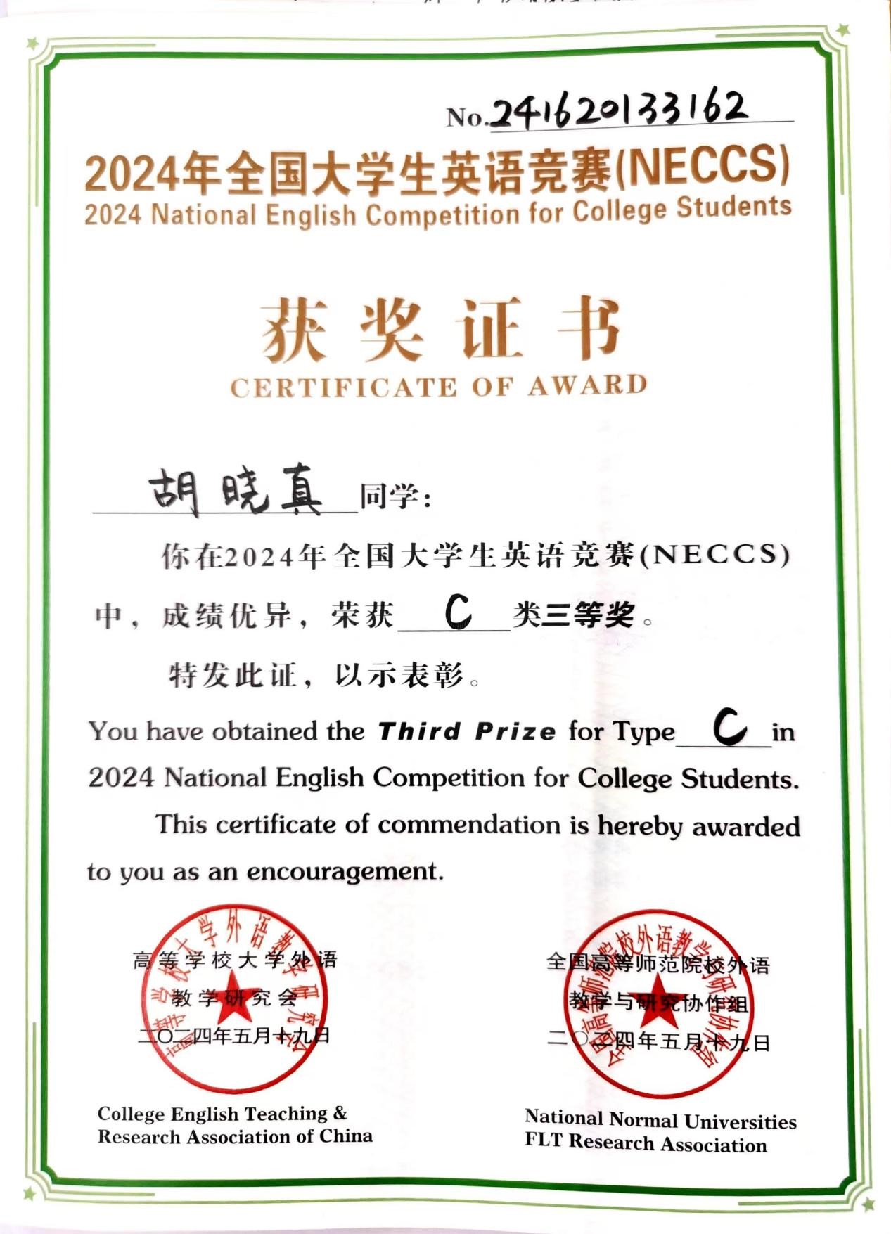 bat365官网胡晓真同学在2024年全国大学生英语竞赛中荣获三等奖,对该获奖同学予以祝贺表彰。