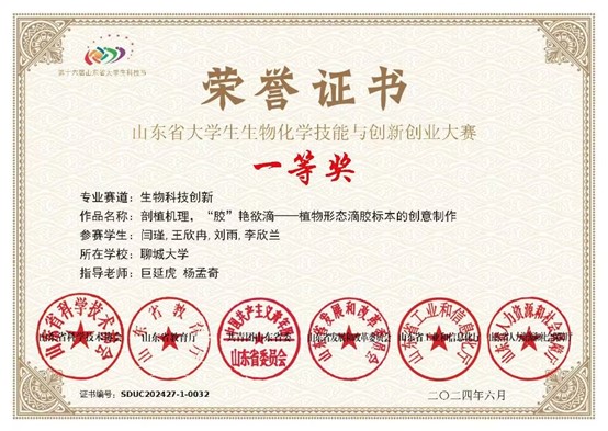 bat365官网刘雨同学在山东省大学生生物化学技能与创新创业大赛中荣获一等奖,对该获奖同学予以祝贺表彰。