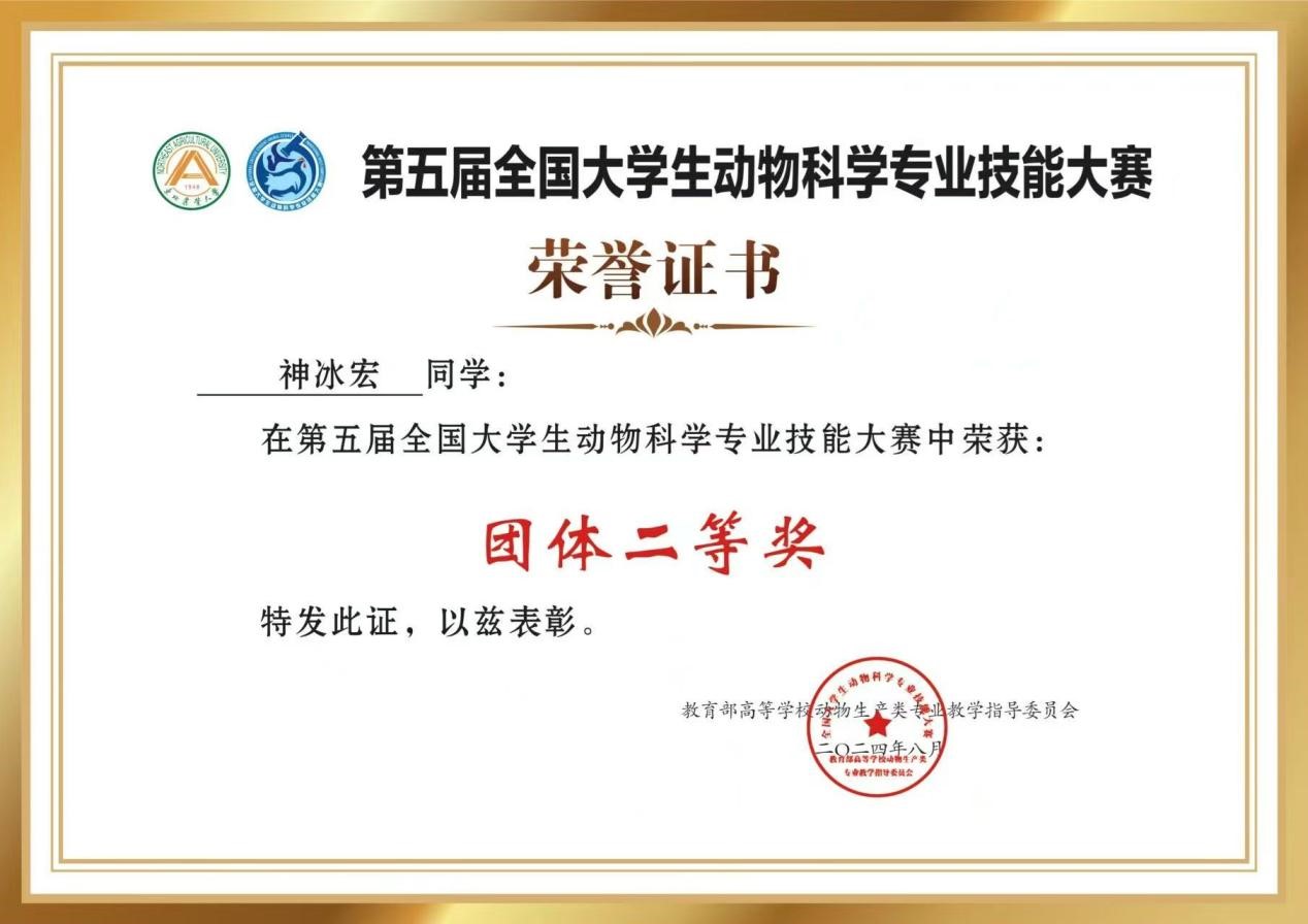 bat365官网神冰宏同学在第五届全国大学生动物科学专业技能大赛中荣获二等奖,对该获奖同学予以祝贺表彰。