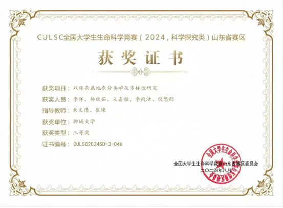 bat365官网王嘉铭同学在CULSC全国大学生生命科学竞赛(2024,科学探究类)山东省赛区中荣获三等奖,对该获奖同学予以祝贺表彰