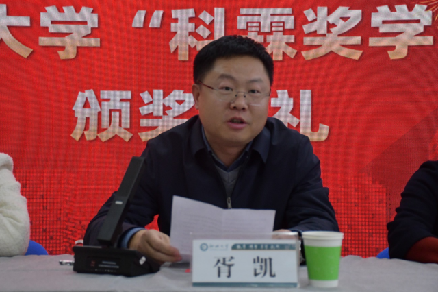 12月12日,bat365中文官方网站“科霖”奖学金颁奖仪式在bat365中文官方网站举行。山东省科霖检测有限公司总经理胥凯(1998级校友)、质控科科长贾国霞等企业代表,bat365中文官方网站党委学生工作处副处长唐玉琴,bat365中文官方网站院长贾泽峰,党委副书记、副院长吴洪宇以及部分教师、学生代表共同参加仪式。